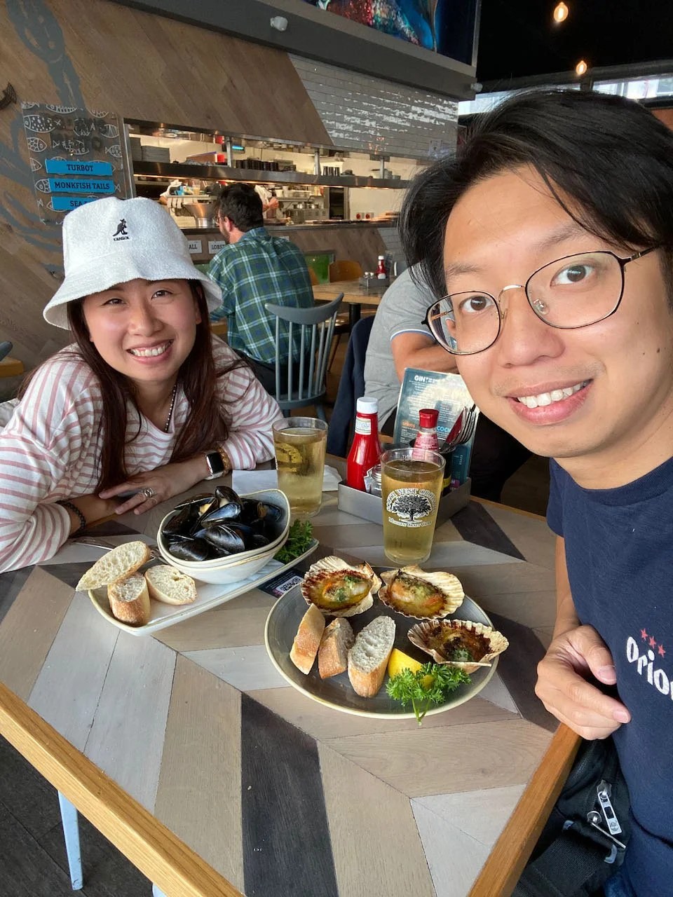 我地叫咗以下菜式,兩個前菜都非常好食!我地平啲都會買青口煮,但呢到嘅青口真係更加肥美,脹卜卜嘅,而家諗返起都流口水呀!個麵包蟹真係非常非常正,超多蟹膏(多到我覺得係咪佢專登填滿佢),超好食!Fish and Chips就相對普通平庸啲,但Haddock都幾好似,唔會好鞋口。